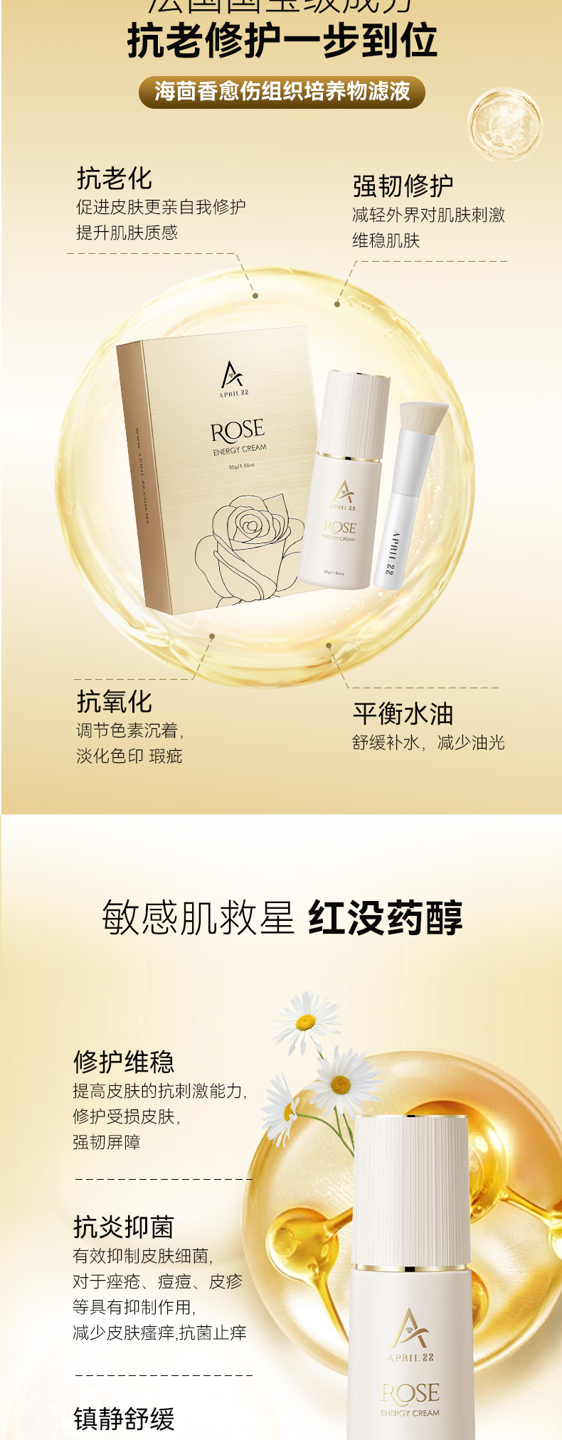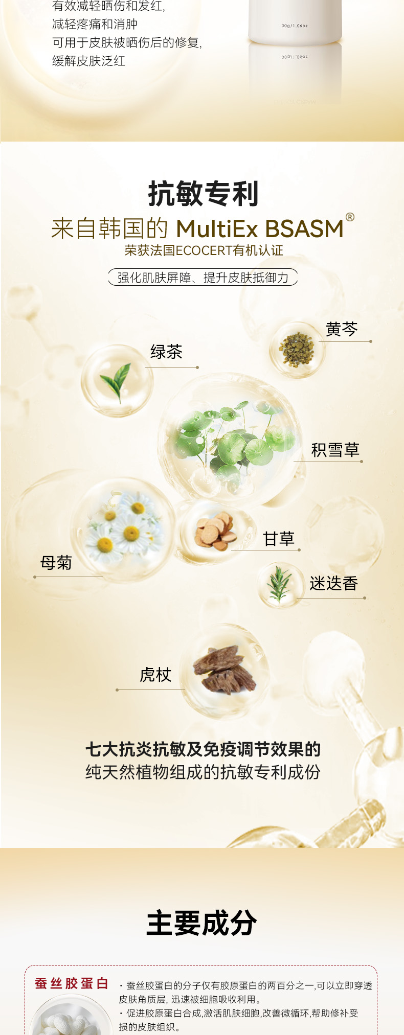 – 敏感肌最爱的红没药醇:它是从纯天然植物中萃取,有效抗菌抗炎、促进伤口愈合和皮肤晒伤修复。等等高效修复成效