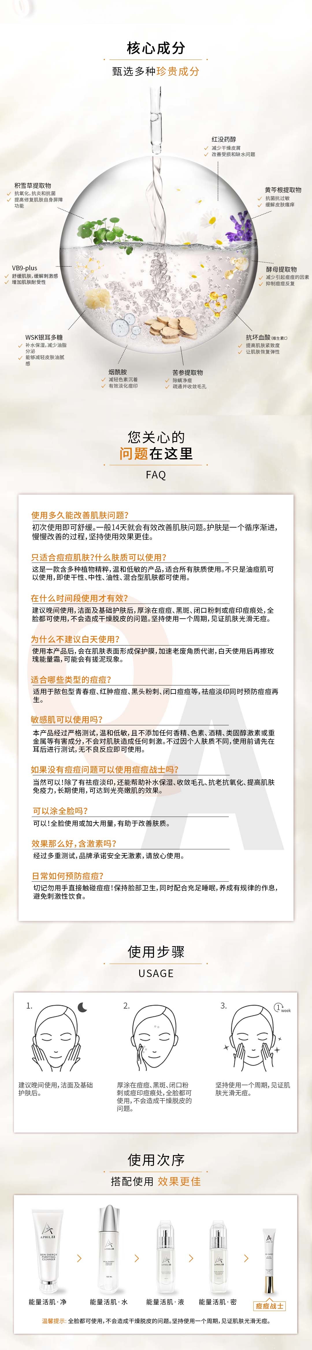 修复肌肤问题(痘痘、痘印、斑点、毛孔粗大、凹凸洞等)、舒缓炎症和敏感、平衡肌肤水油、美白淡斑、抗老抗氧化
