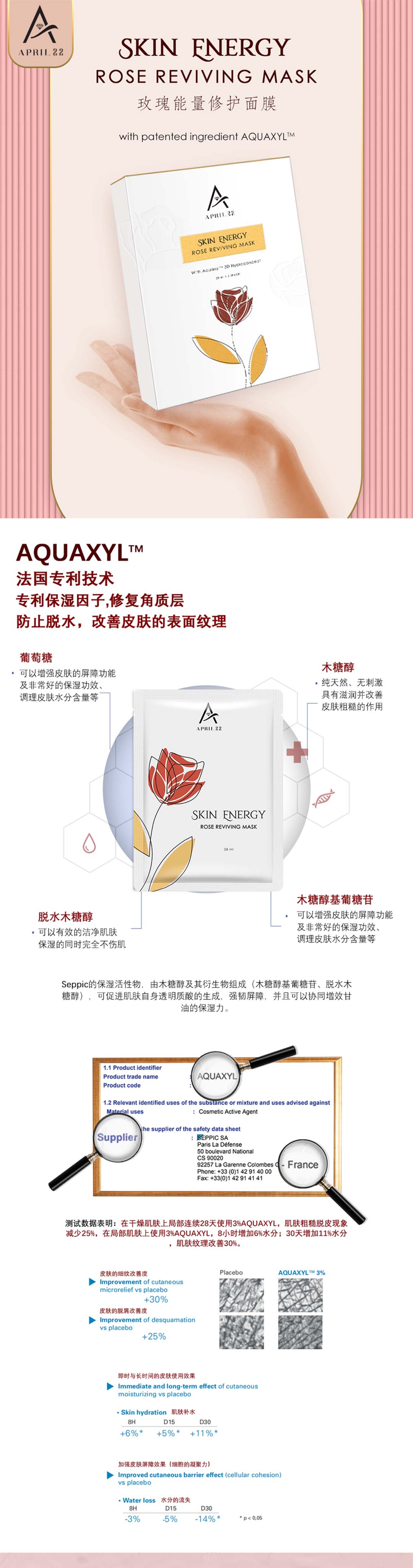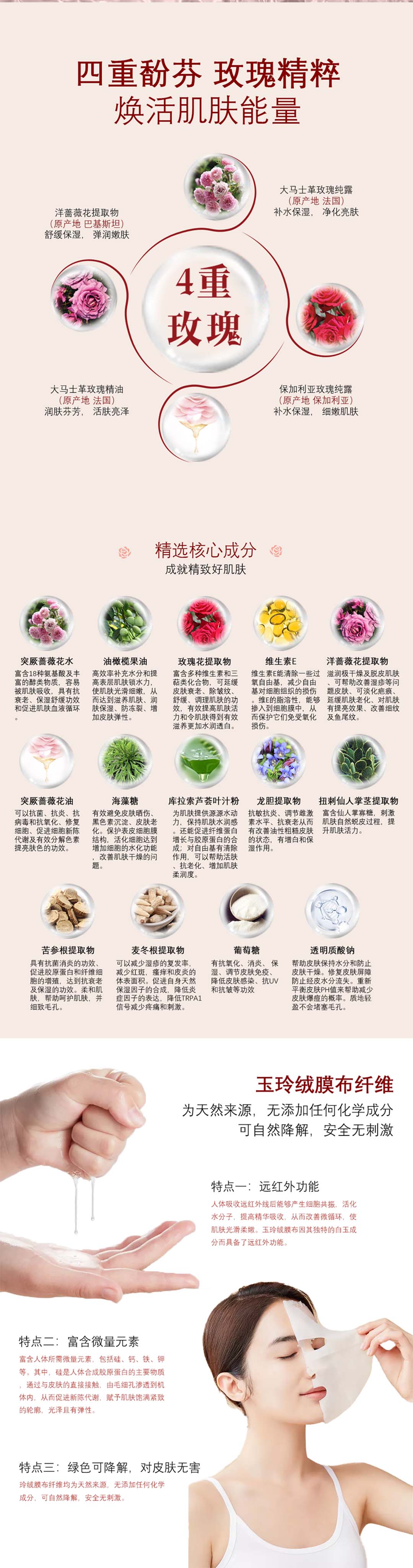 天然馥郁的玫瑰香气,可让您放松身心,舒缓疲惫,每次敷面膜都是一场肌肤与心灵的宁静享受。
